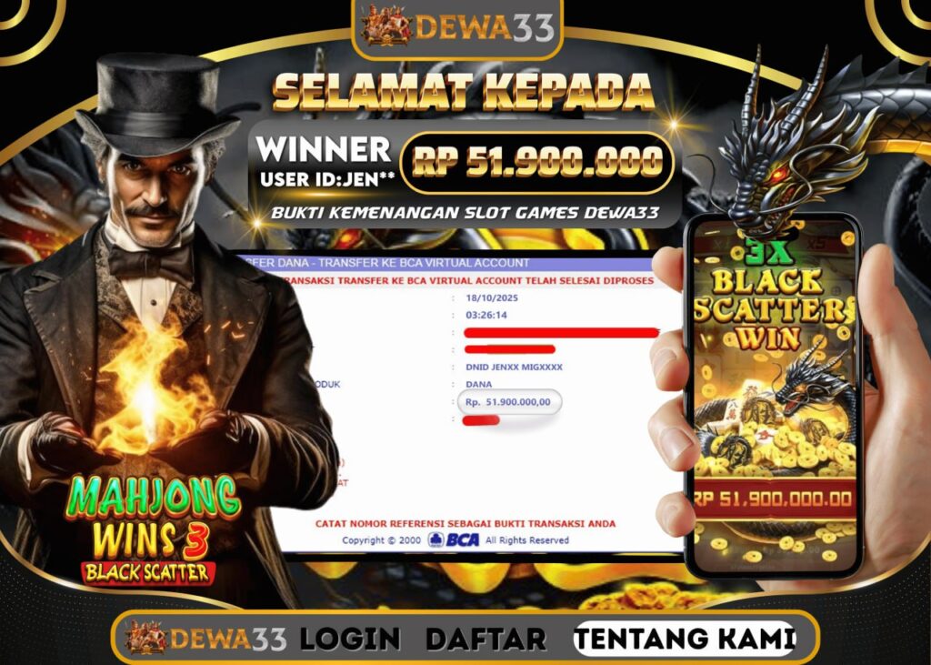 Member jenxx Menang Fantastis Rp 51.980.000 di Slot Mahjong Wins 3 di DEWA33!