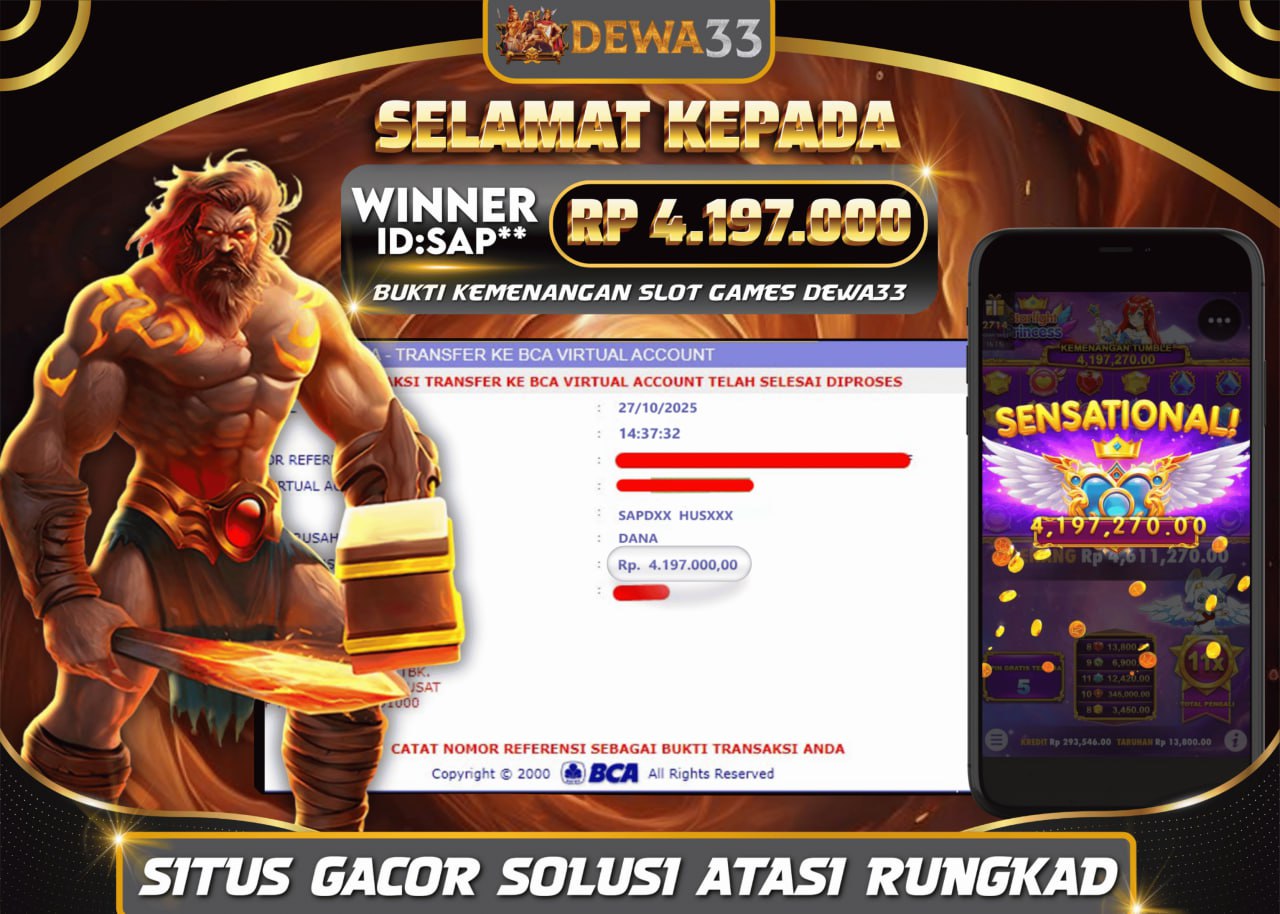 Kabar kemenangan kembali datang dari situs DEWA33, tempat bermain slot online terpercaya dan paling banyak memberikan bonus menarik! Kali ini, salah satu member setia dengan ID SAP* berhasil membawa pulang kemenangan sebesar Rp 4.197.000 hanya dengan memanfaatkan bonus deposit tambahan 10% dari promo yang sedang berlangsung.