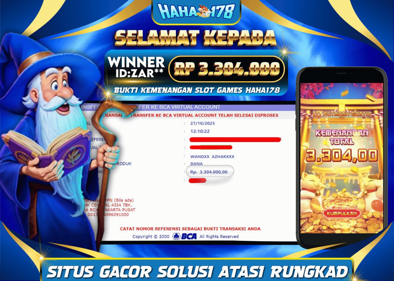 Kemenangan Rp 3.304.000 ini membuktikan bahwa HAHA178 benar-benar memberikan peluang nyata bagi para pemainnya untuk meraih hasil besar. Dengan sistem permainan yang adil, proses transaksi cepat, serta dukungan layanan pelanggan 24 jam, setiap pemain memiliki kesempatan yang sama untuk merasakan sensasi menang besar seperti ID ZAR* hari ini.