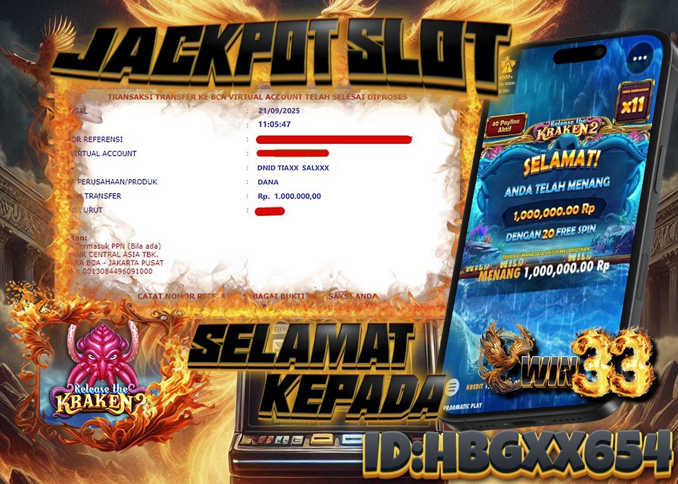 Kemenangan kembali hadir di situs slot terpercaya WIN33! Pada tanggal 21 September, pemain beruntung dengan ID: HBGXX654 berhasil meraih kemenangan sebesar Rp 1.000.000 dalam permainan slot populer bertema petualangan laut dalam, Release the Kraken 2.