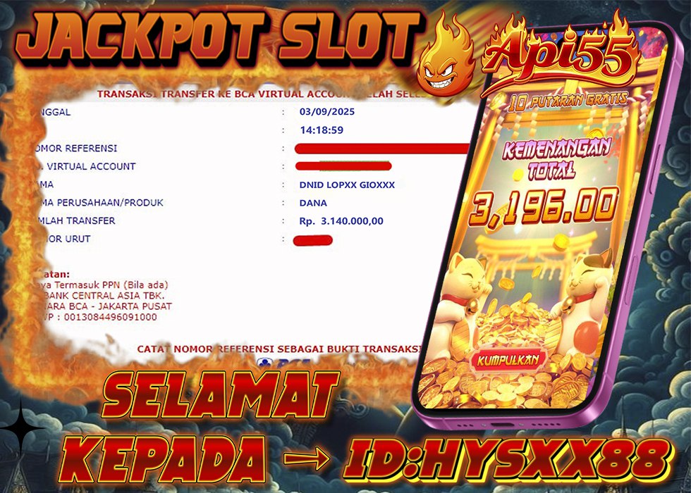 Kemenangan Rp 3.196.000 dari ID: HYSXX88 adalah bukti nyata kalau Api55 selalu memberikan pembayaran cepat, adil, dan transparan kepada setiap member. Tidak ada tipu-tipu, hanya permainan fair play dengan kesempatan jackpot nyata.