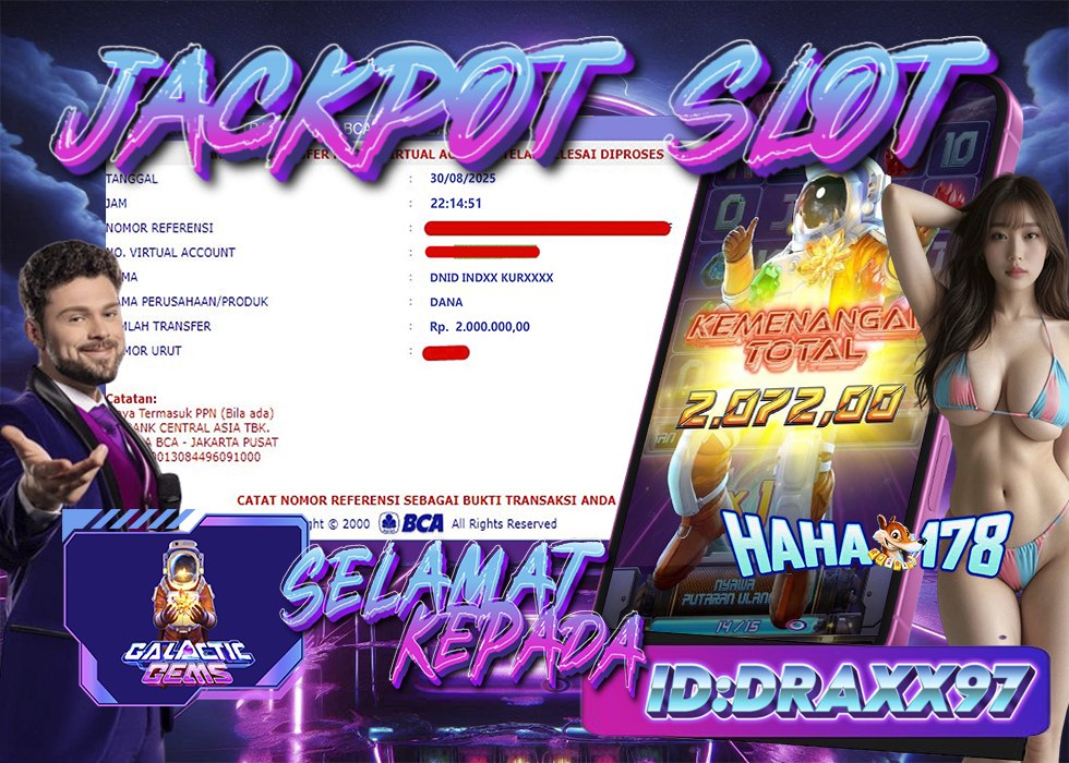 Kabar bahagia datang dari dunia slot online. Salah satu member setia HAHA178 dengan ID: DRAXX97 sukses meraih kemenangan fantastis senilai Rp 2.072.000 hanya dari satu putaran permainan di slot Galactic Gems!