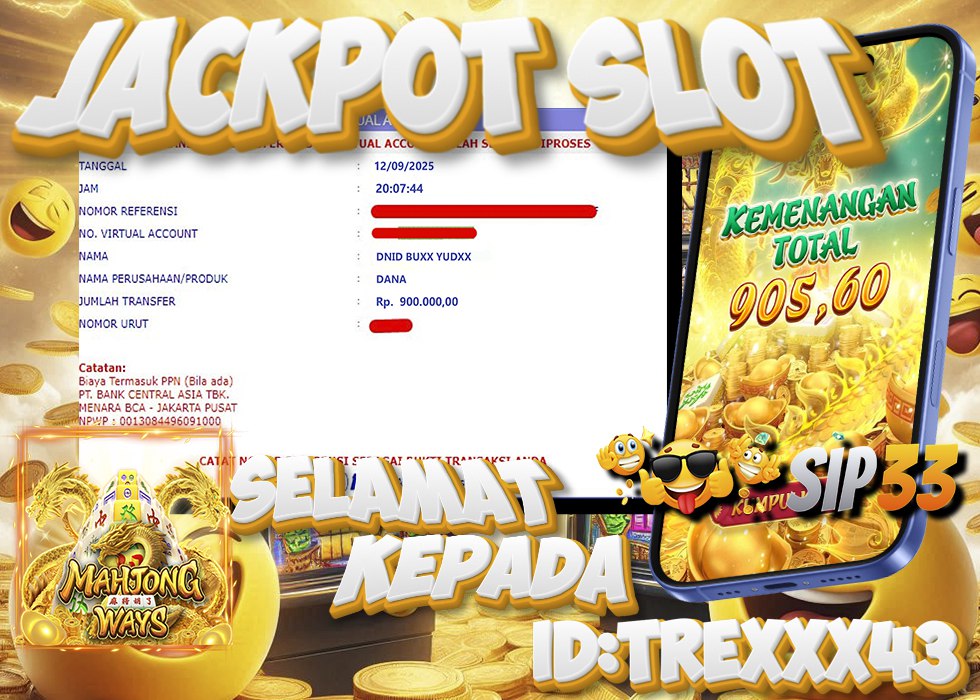 Tanggal 12 September 2025 menjadi hari penuh keberuntungan bagi salah satu member setia SIP33. Dengan ID TREXX43, ia berhasil menaklukkan game Mahjong Ways dan meraih kemenangan fantastis sebesar Rp 905.600,00 hanya dengan modal transfer Rp 900.000,00.