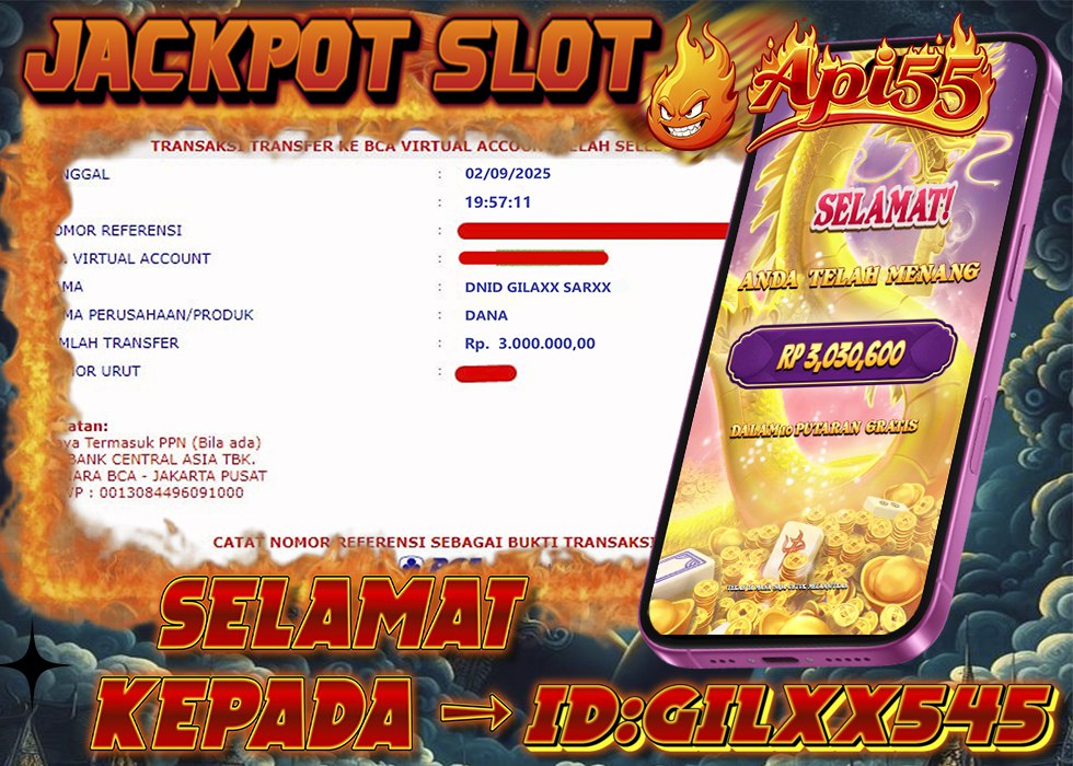 Kabar gembira kembali hadir dari API55, salah satu situs slot online terpercaya dengan RTP tinggi dan peluang jackpot besar setiap hari. Pada 12 September 2025, seorang member dengan ID GILXX545 berhasil membawa pulang kemenangan fantastis senilai Rp 3.030.600 hanya dalam putaran gratis.