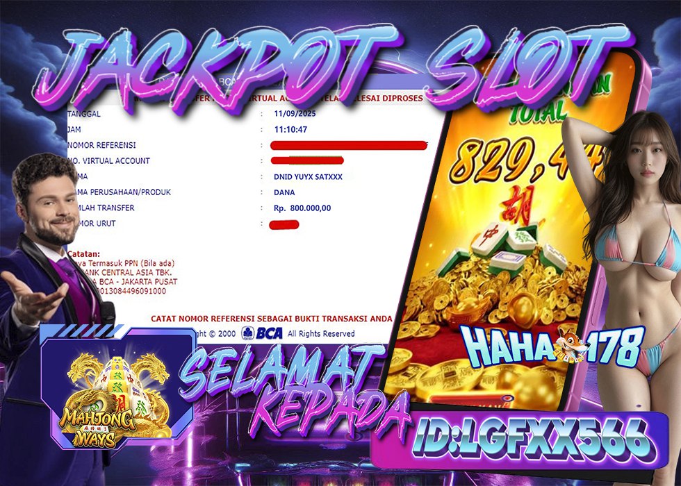 Tanggal 11 September 2025 menjadi hari keberuntungan bagi salah satu pemain setia HAHA178. Dengan modal deposit hanya Rp 800.000, pemain dengan ID LGFXX566 berhasil mencetak kemenangan spektakuler sebesar 829,43 di permainan Mahjong Ways.