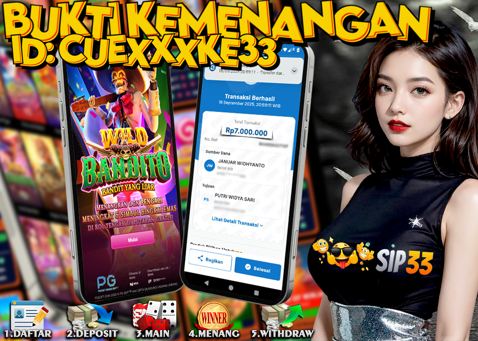 SIP33 kini menjadi sorotan para pecinta slot online karena terbukti memberikan pengalaman bermain yang aman, seru, dan penuh peluang menang. Dengan berbagai pilihan game dari provider ternama, SIP33 menawarkan game-game gacor yang siap membayar kemenangan besar. Salah satu contoh nyatanya datang dari member dengan ID CUEXXXKE33 yang berhasil memenangkan Rp 7.000.000 dari permainan Wild Bandito, salah satu slot paling populer dari PG Soft. Permainan ini terkenal dengan animasi menarik dan fitur bonus besar yang bisa memberikan pengganda kemenangan hingga puluhan kali lipat. Kemenangan fantastis ini bukan hanya keberuntungan, tapi juga bukti bahwa SIP33 adalah situs slot gacor terpercaya yang benar-benar membayar.