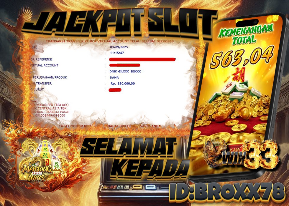Kabar gembira kembali datang dari dunia slot online. Kali ini, kemenangan besar berhasil diraih oleh member WIN33 dengan ID BROXX78 pada tanggal 13 September 2025. Hanya dengan modal transfer Rp 520.000, ia sukses membukukan kemenangan total sebesar 563,04 dalam permainan Mahjong Ways.