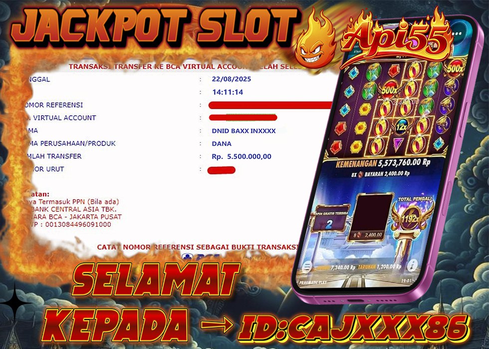 Game dari Pragmatic Play memang selalu menjadi favorit di kalangan pemain karena menghadirkan tema menarik, fitur bonus melimpah, serta peluang kemenangan besar. API55 sebagai situs resmi menghadirkan berbagai pilihan game Pragmatic Play yang bisa dimainkan kapan saja. Kesuksesan member dengan ID CAJXXX86 dalam meraih kemenangan Rp 5.500.000 menjadi inspirasi bagi banyak pemain lain untuk mencoba keberuntungan mereka. Dengan strategi bermain yang tepat dan didukung platform terpercaya seperti API55, peluang menang besar selalu terbuka lebar.