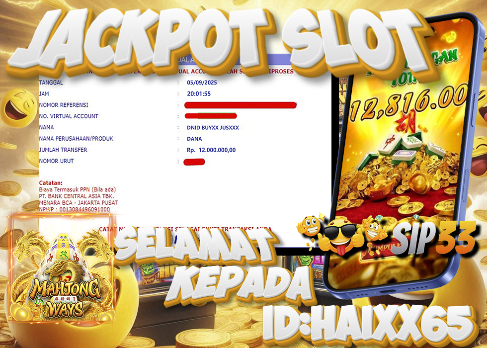 Kemenangan besar kembali tercatat di SIP33. Kali ini, member dengan ID HAIXX65 berhasil membawa pulang hadiah fantastis senilai Rp12.000.000 dari permainan populer Mahjong Ways. Dalam satu sesi permainan penuh keberuntungan, kombinasi simbol bernilai tinggi muncul beruntun dan langsung menghasilkan kemenangan luar biasa.