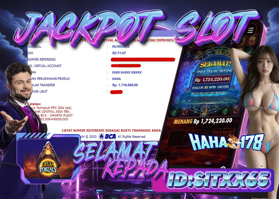 Kemenangan besar kembali tercatat di HAHA178, salah satu situs slot online terpercaya dan gacor. Pada kesempatan kali ini, seorang member dengan ID SITXX65 berhasil meraih hadiah fantastis senilai Rp1.724.220 hanya dari 10 Spin Gratis di game populer Fire Portals.