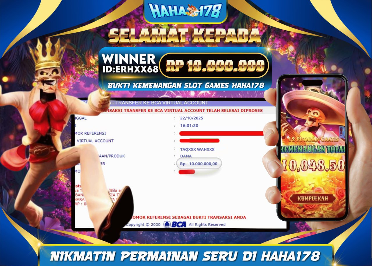 Kabar kemenangan besar kembali mengguncang dunia slot online! Salah satu member setia situs HAHA178 dengan ID ERHXX68 sukses mencetak kemenangan fantastis sebesar Rp 10.000.000 pada 24 Oktober 2025. Hebatnya lagi, kemenangan ini diraih hanya dengan tambahan modal bonus deposit yang diperoleh melalui aplikasi resmi (APK) HAHA178.