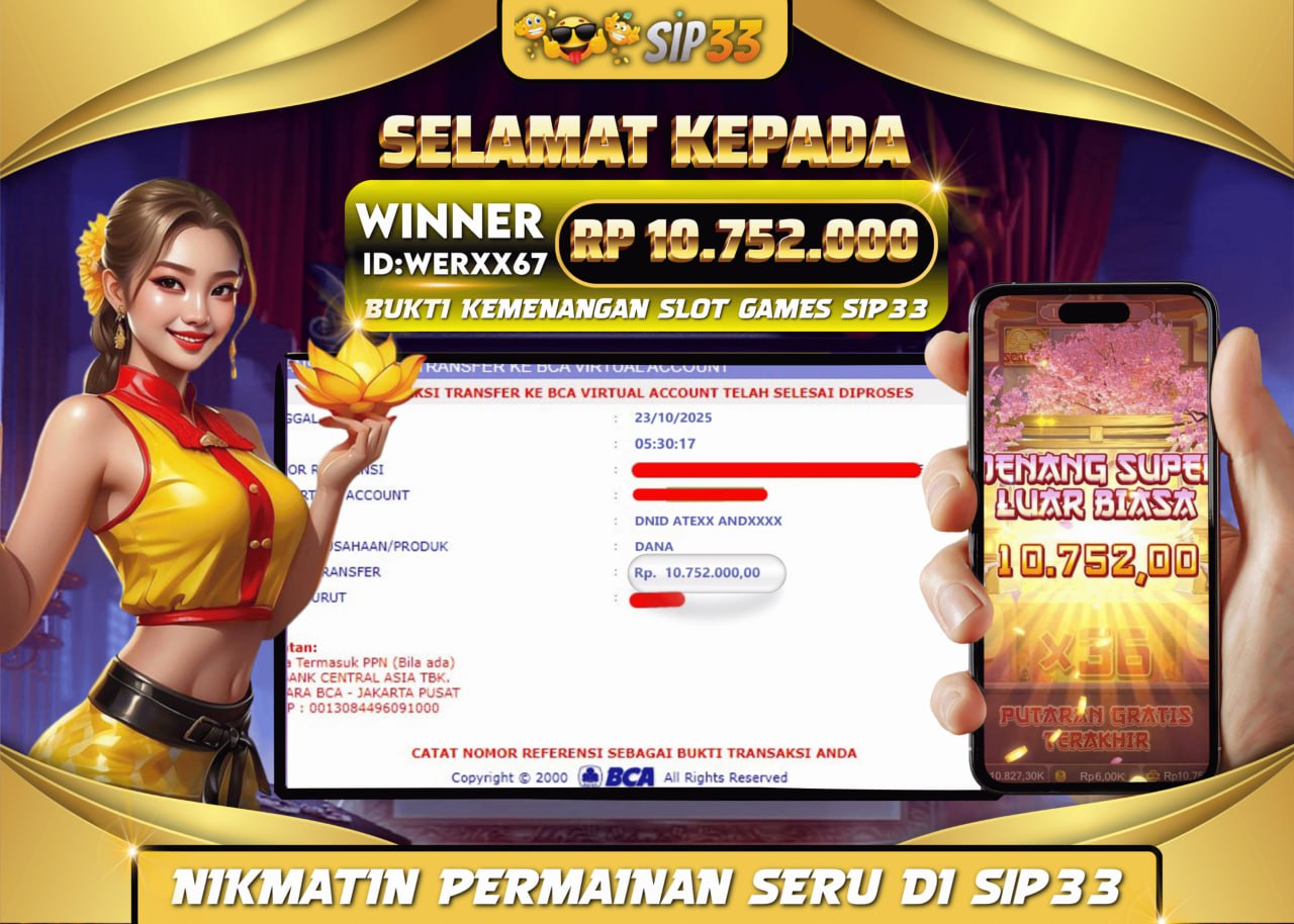 Situs slot online SIP33 kembali menghadirkan kabar menggembirakan bagi para pecinta game slot! Kali ini, salah satu member setia dengan ID WERXX67 berhasil membawa pulang kemenangan fantastis sebesar Rp 10.752.000 pada tanggal 23 Oktober 2025.