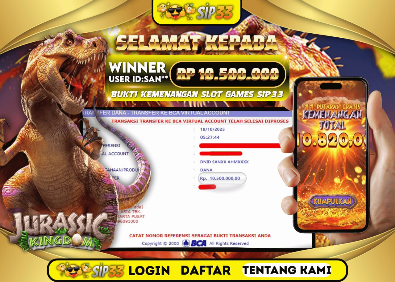 SIP33 kembali menghadirkan kabar mengejutkan! Seorang member setia dengan username “sanxx” berhasil membuktikan bahwa keberuntungan bisa datang kapan saja. Bermain game slot bertema prasejarah, Jurassic Kingdom, ia sukses membawa pulang kemenangan fantastis sebesar Rp 10.500.000 hanya dalam satu sesi permainan pada 19 Oktober 2025.