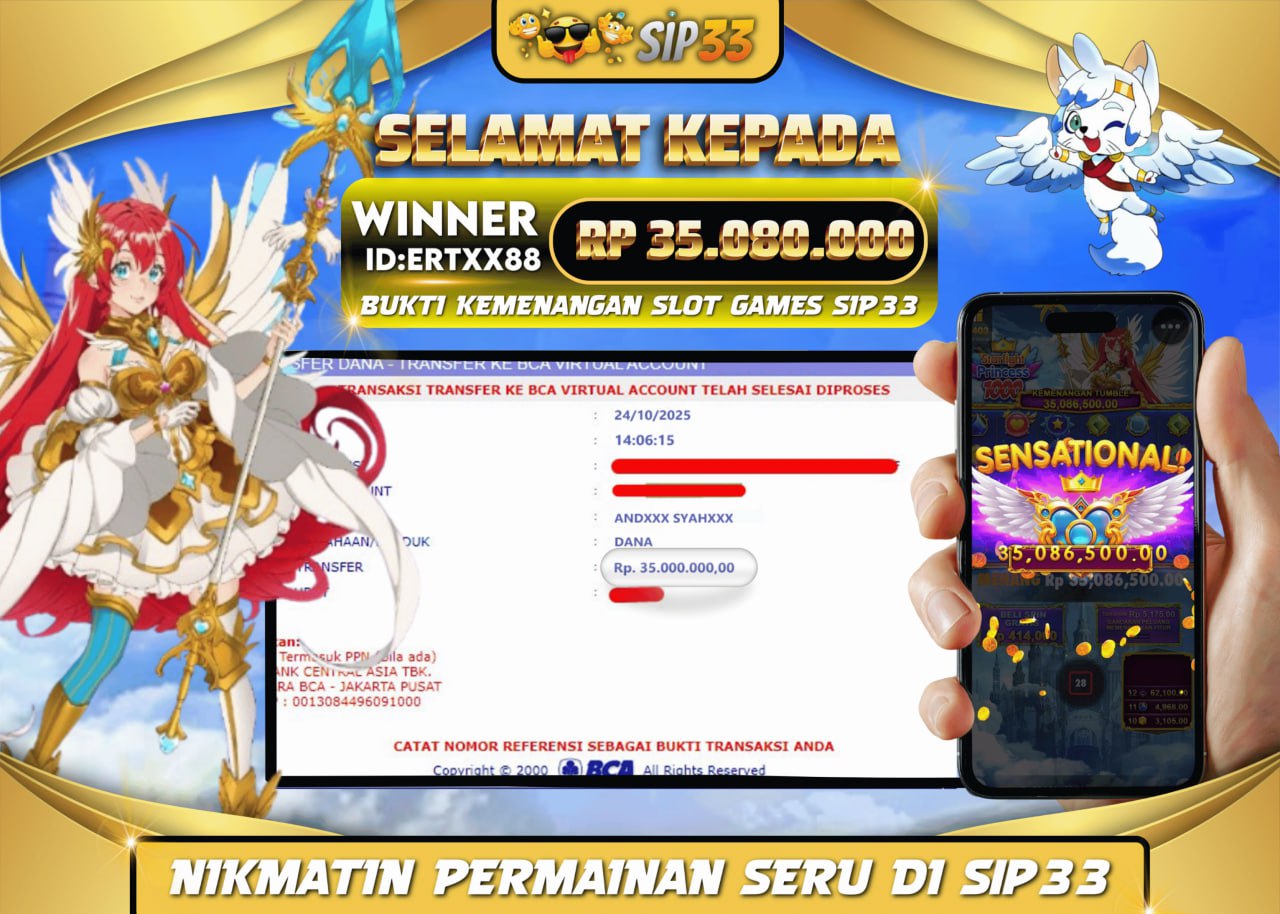 Kabar menggembirakan datang dari dunia slot online! Pada tanggal 24 Oktober 2025, salah satu pemain setia situs SIP33 dengan ID: ERTXX88 sukses meraih kemenangan besar sebesar Rp35.000.000 hanya dari permainan slot favoritnya.