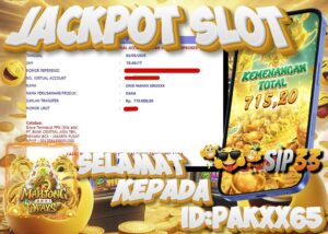 🎉 Kemenangan Manis Member PAKXX65 Pada tanggal 13 September 2025, kabar bahagia datang dari salah satu member setia SIP33 dengan ID PAKXX65. Bermodal deposit sebesar Rp 710.000, ia berhasil meraih kemenangan 715,20 saat bermain game slot populer Mahjong Ways. Kemenangan
