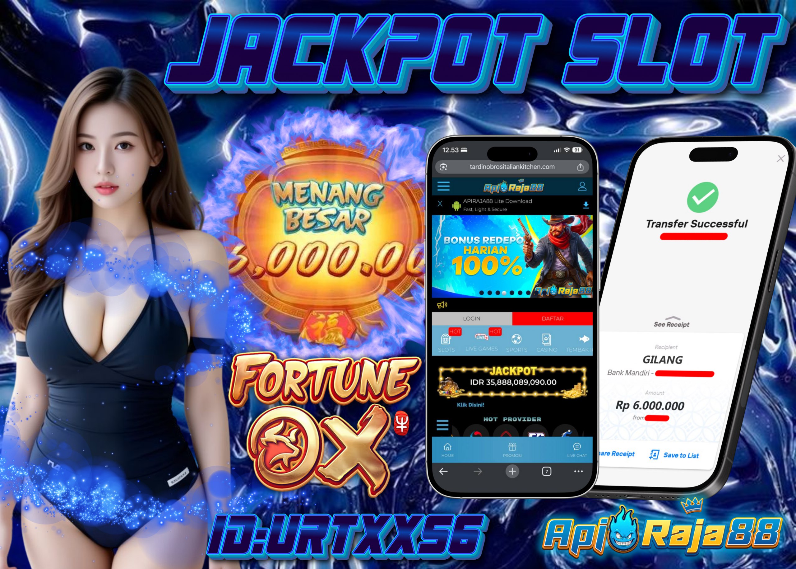 Kabar gembira datang dari situs slot terpercaya APIRAJA88! Salah satu member aktif dengan ID URTXX56 berhasil membawa pulang Rp 6.000.000 dari game legendaris FORTUNE OX, hanya dalam satu sesi bermain. Yang bikin makin seru, kemenangan ini terjadi setelah sang pemain memanfaatkan bonus deposit harian 10% sebagai tambahan modal!