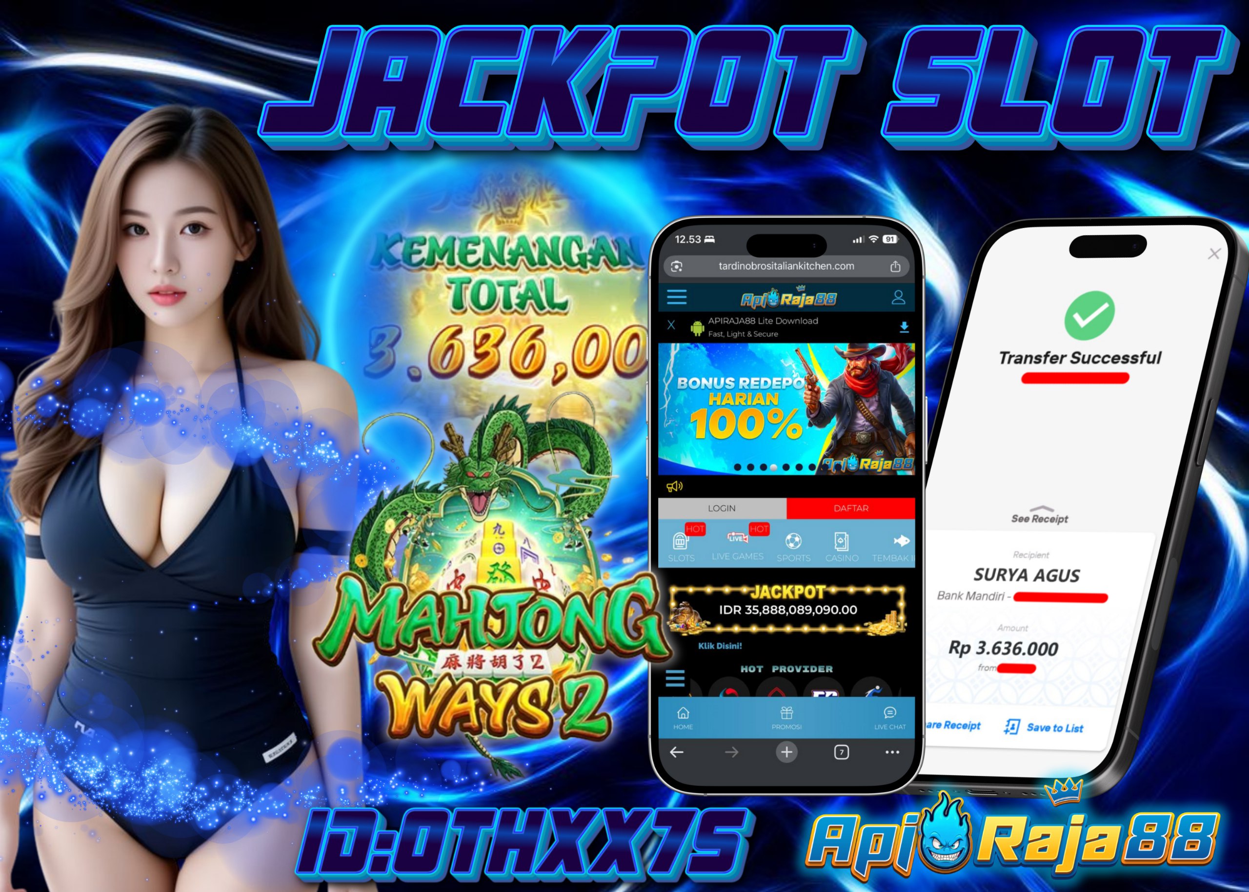 Kabar bahagia datang dari situs slot terpercaya APIRAJA88! Pada tanggal 17 Oktober 2025, salah satu member setia dengan ID OTHXX75 berhasil meraih kemenangan besar senilai Rp3.636.000 dari permainan slot populer Mahjong Ways 2! Yang lebih luar biasa, kemenangan ini didapatkan dengan tambahan modal dari Bonus Deposit 100% yang sedang berlangsung di situs.